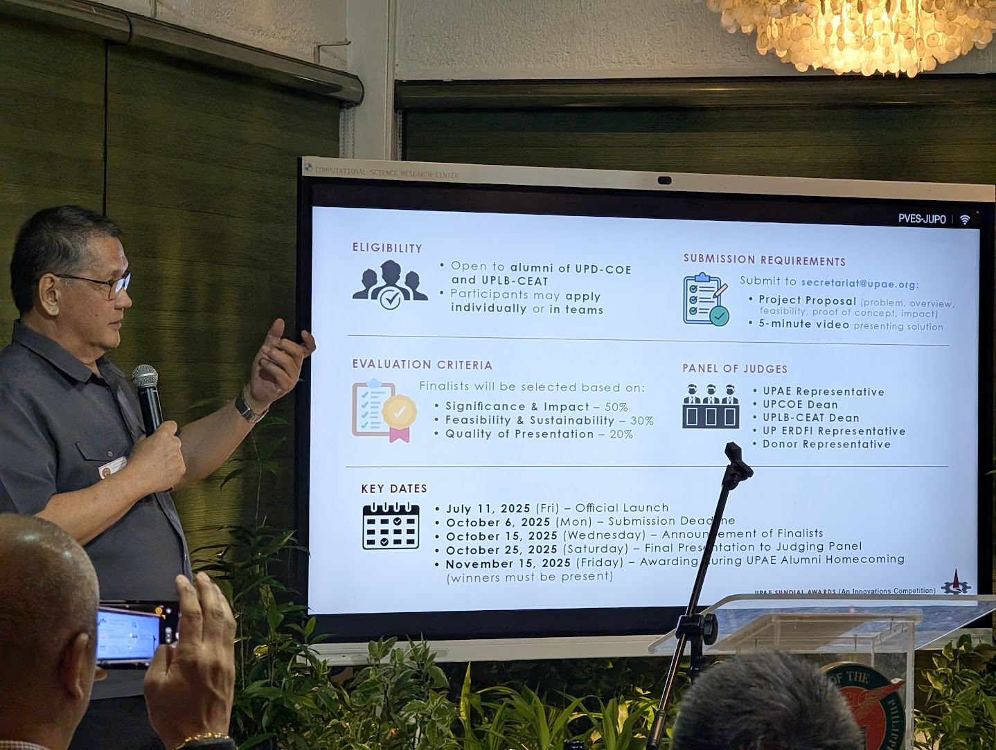 Engr. Roberto “Choi” Nazareno, UPAE Vice President for External Affairs, detailed the competition mechanics, emphasizing the criteria of impact (50%), feasibility and sustainability (30%), and quality of presentation (20%). Entries must include a written proposal and a five-minute video pitch. Judging panels will include representatives from UPAE, the UP College of Engineering, UPERDFI, and the sponsoring donors. Finalists will receive up to ₱150,000 and the distinguished Sundial Trophy during the upcoming 2025 UPAE Alumni Homecoming on November 2025 (final date to be announced).